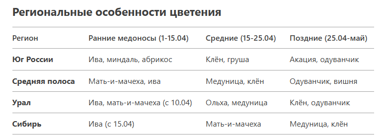 Апрель - переломный месяц в пчеловодном сезоне, когда природа пробуждается и появляются первые серьезные источники нектара. Зная точные сроки цветения медоносов, пчеловод может эффективно планировать сезонные работы. Представляем детальный календарь цветения с разбивкой по регионам и рекомендациями по уходу за пасекой. ✔ Мать-и-мачеха (Tussilago farfara) ✔ Ива козья (Salix caprea) ✔ Ольха серая (Alnus incana) ✔ Медуница лекарственная (Pulmonaria officinalis) ✔ Клён остролистный (Acer platanoides) ✔ Одуванчик лекарственный (Taraxacum officinale) ✔ Вишня обыкновенная (Cerasus vulgaris) ⚠ Метеориски: ⚠ Фиториски: Вывод: Апрельский медосбор хоть и не бывает обильным, но критически важен для развития пчелиных семей. Точное знание сроков цветения медоносов в вашем регионе позволяет оптимально планировать пасечные работы и получать сильные семьи к главному медосбору.