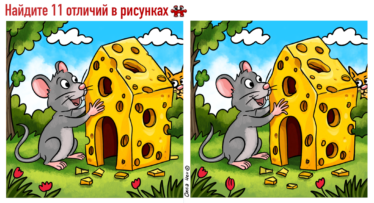 Сегодня сюжет не хитрый: мечта всякой мышки - много сыра в домике, а если еще и сам домик из сыра, так и еще интереснее. На картинках много не только сыра, но и отличий - целых 11 штук. Испытание на внимательность! Удачи:) Горизонтальный тест: Вертикальный тест: Атмосфера на живой картинке: Ответ: