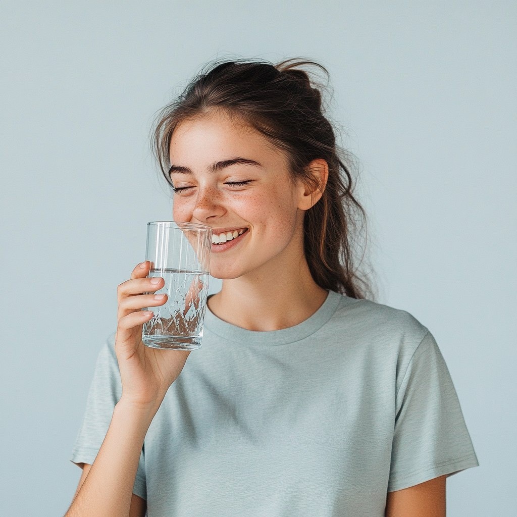 Создано на основе запроса: on a light blue/white background a girl in a T-shirt happily drinks water from a glass