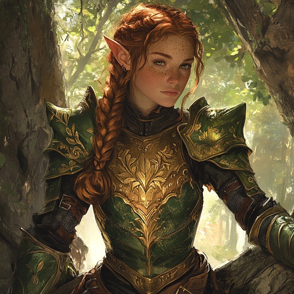 Создано на основе запроса: fantasy concept art of a female wood elf with freckles, single braided auburn hair, green eyes, and she’s wearing