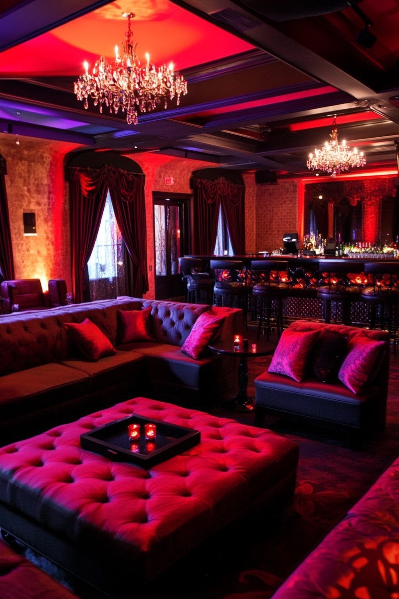 Создано на основе запроса: Red and black lounge club interior design with red lighting, seating area, tables, and couches