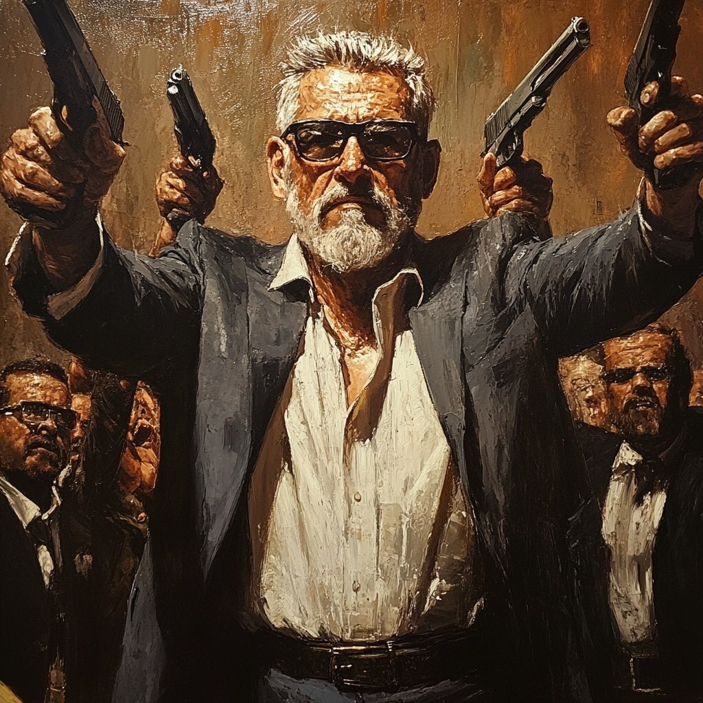 Создано на основе запроса: imagine an older italian maffia boss, his hands raised controlling an army of thugs