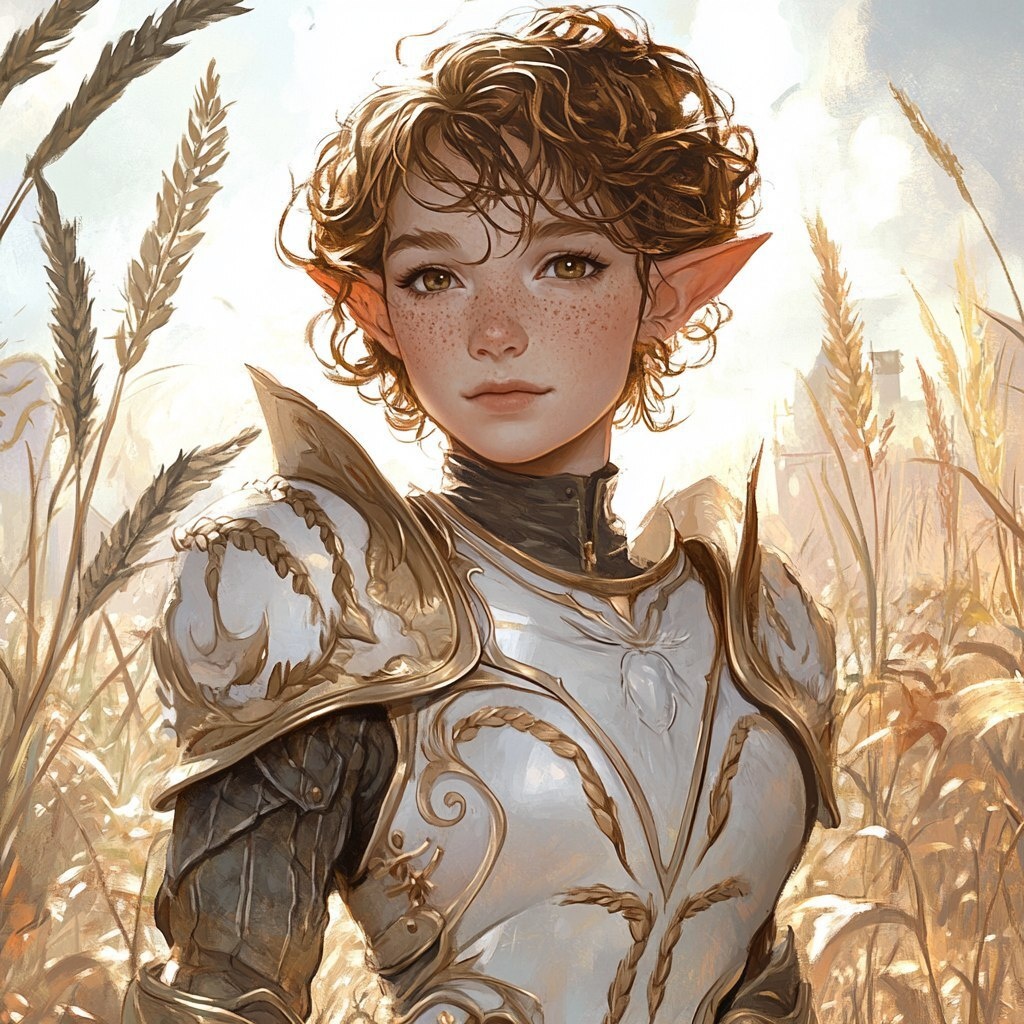 Создано на основе запроса: fantasy concept art of a female elf with freckles, short messy wavy brown hair with messy bangs, hazel eyes, and she’s wearing light gold and white knight’s plate armor with wheat designs and knight’s helmet. She’s in town with a meadow at sunrise far away. Full body shot --- Автоперевод: Фэнтезийное концептуальное искусство женского эльфа с веснушками, короткие грязные каштановые волосы с грязными челками, карими глазами, и она носит светло -золото и тарелку белого рыцаря с дизайном пшеницы и шлемом рыцаря. Красиво выглядит? 🤔 https://dzen.ru/id/65c0c65c86e4f837c27b24d7 #ИИ #AI #нейросеть #midjourney #art
