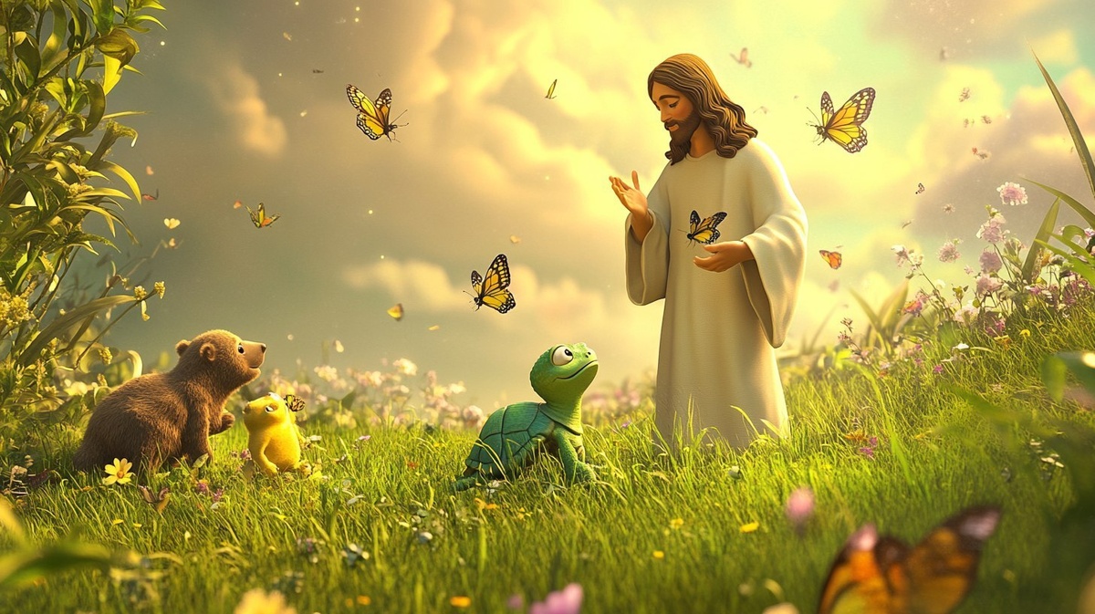 Создано на основе запроса: 3d cartoon animated Jesus standing with the turtle, chameleon and baby bear gathered around Him in a green meadow
