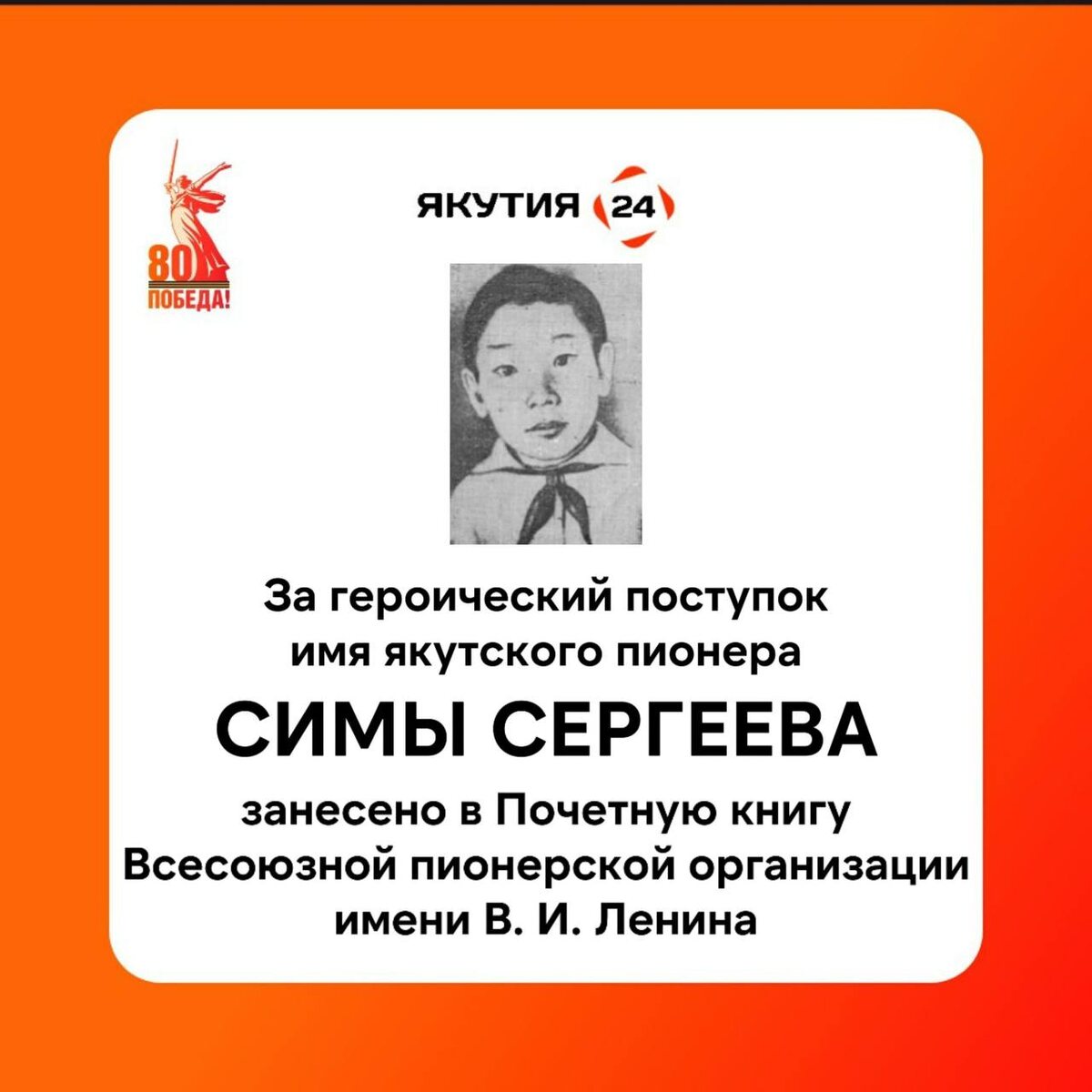 Факт №50: 28 января 1988 года в Почетную книгу Всесоюзной пионерской организации имени В. И. Ленина занесли имя одиннадцатилетнего якутского героя-пионера Симы Сергеева. Он, защищая колхозное добро, в 1942 году был убит от рук бандита-вора Николая Григорьева в деревне Орга Чурапчинского района.