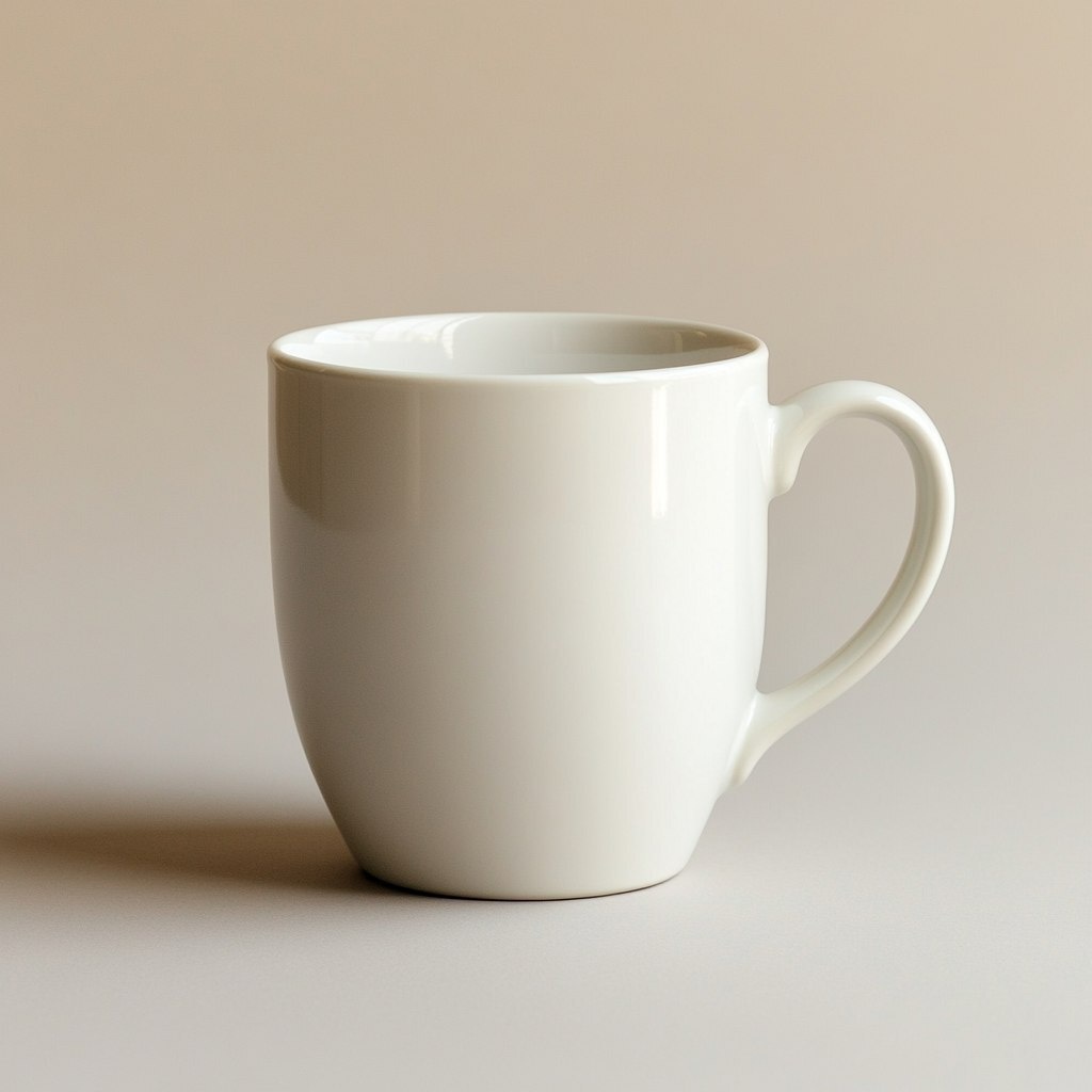 Создано на основе запроса: a single, white ceramic mug, classic cylindrical shape, comfortable C-shaped handle on the right side, smooth glossy surface, studio lighting, soft shadow underneath, isolated on a light background