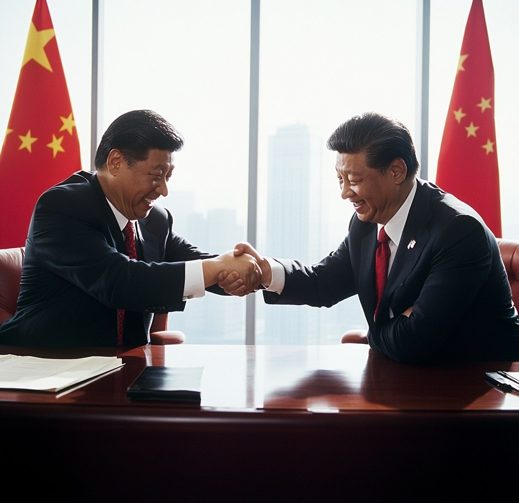 Создано на основе запроса: High-resolution photo of and the leader of china, stylishly dressed in suits, sitting at an office desk