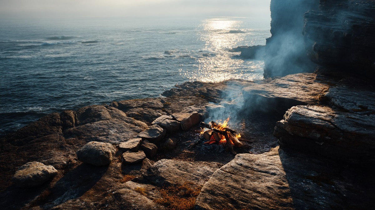 Создано на основе запроса: campfire in a dramatic ocean cliff, still shimmering water, early morning light casting long shadows, sea mist in