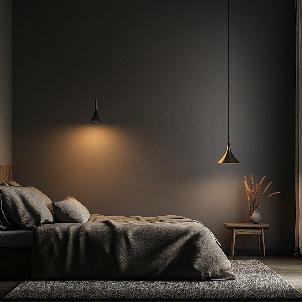 Создано на основе запроса: image of a bedroom, minimal, cosy, modern, nice lighting
