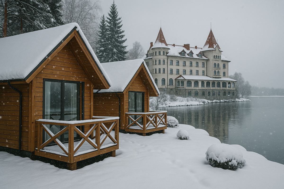 - Особенности: коттеджи с сауной и камином, ресторан.