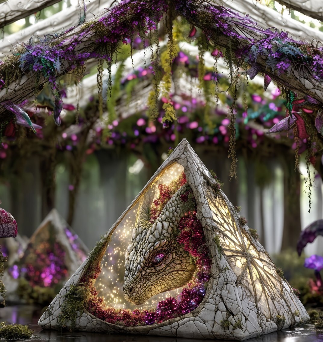 Создано на основе запроса: Hyper-realistic photo of an ancient white stone pyramid cracked open like fruit, with glowing seeds spilling out, a dragonfruitdragon curled inside a hollow chamber, its wings folded like wilted petals, eyes like blooming orchids, sunlight piercing through the cracks, casting long shadows across a jungle overrun with mutant flytrap plants, air thick with spores and surreal tension --- Автоперевод: Гиперреалистичная фотография древней белой каменной пирамиды, раскрытой, как плоды, со светящимися семенами, выплющимися, дракона, скручиваемого в полой камере, его крылья складываются, как лепестки, глаза, как цветущие орхидеи, солнечные свети Неплохо получилось? 🤔 https://dzen.ru/id/65c0c65c86e4f837c27b24d7 #ИИ #AI #нейросеть #midjourney #art