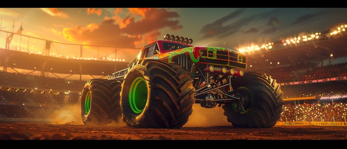 Создано на основе запроса: A candy apple red monster truck with a neon green lightning bolt with fat tires and chrome bumpers. the truck is in the middle of a stadium surrounded by spectators. Acid color pallette, at sunset under an orange desert sky 8k, hyper-realistic