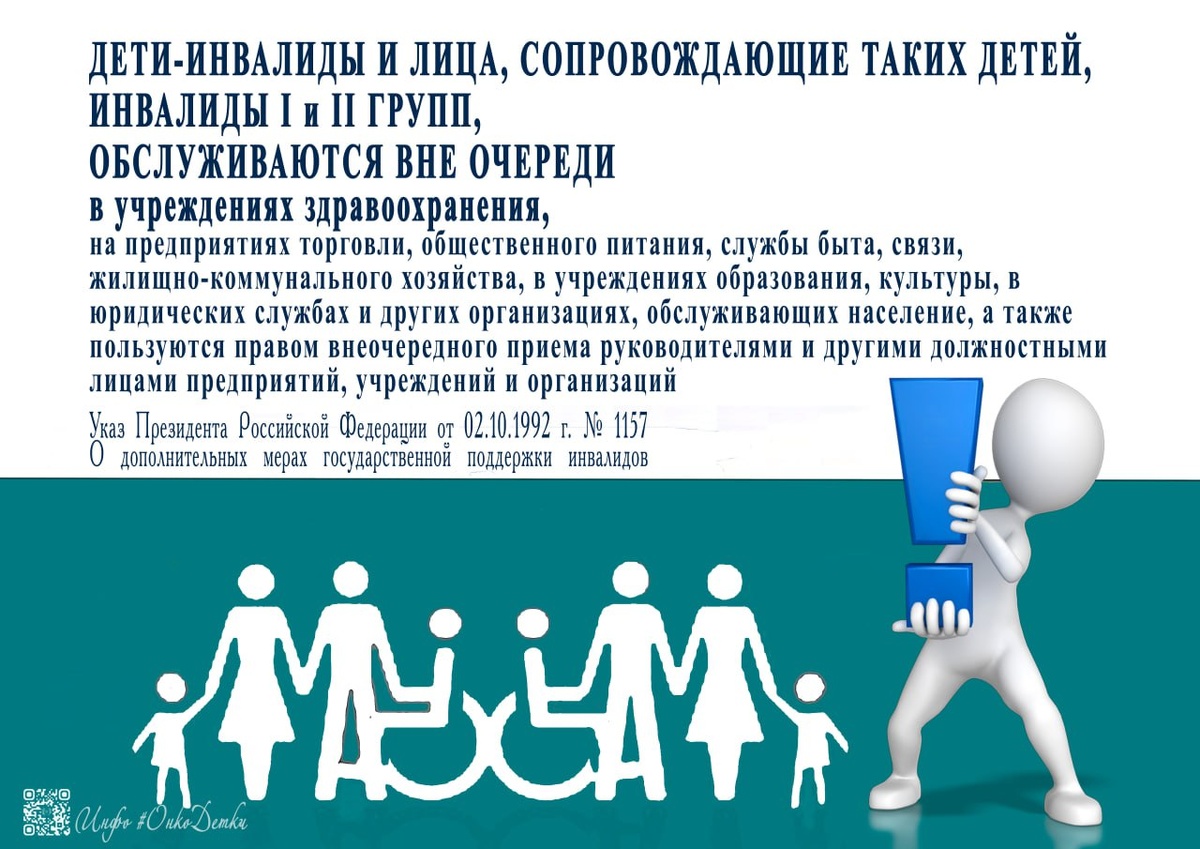 ✅НАПОМИНАЕМ ДЕТИ-ИНВАЛИДЫ И ЛИЦА, СОПРОВОЖДАЮЩИЕ ТАКИХ ДЕТЕЙ, и ИНВАЛИДЫ I и II ГРУПП, ОБСЛУЖИВАЮТСЯ ВНЕ ОЧЕРЕДИ: ▪️ В учреждениях здравоохранения ▪️ На предприятиях торговли, общественного питания, службы быта, связи, жилищно-коммунального хозяйства ▪️ В учреждениях образования, культуры ▪️ В юридических службах ▪️ В других организациях, обслуживающих население. Также они имеют право на внеочередной прием руководителями и другими должностными лицами предприятий, учреждений и организаций Кроме того, детям-инвалидам и детям, один из родителей которых является инвалидом, в первоочередном порядке предоставляются места в лечебно-профилактических и оздоровительных учреждениях, а также в дошкольных образовательных организациях. Регламентирующие документы: 📃 Указ Президента Российской Федерации от 26.07.2021 № 437 "О внесении изменения в Указ Президента Российской Федерации от 2 октября 1992 г. № 1157 "О дополнительных мерах государственной поддержки инвалидов" 📃 Указ Президента Р