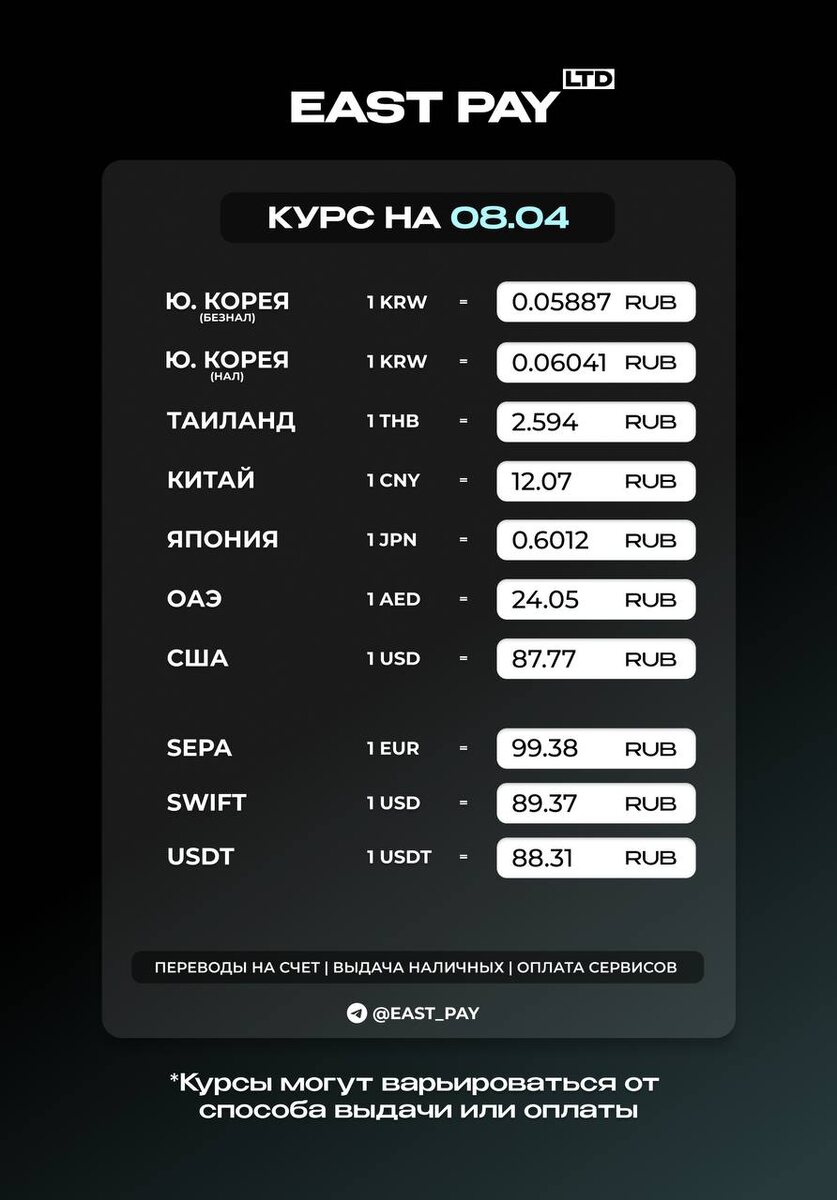 💙SWIFT / SEPA переводы 💙Пополнение зарубежных счетов 💙Выдача наличных за границей 💙Криптовалюты 🔘В течение дня курс может меняться. Рекомендуем уточнять актуальный курс у менеджера. ❗️У нас открылся новый офис в Москве по адресу: Пресненская набережная, 12, Башня Федерации (восточный вход) 🔴🔴🔴🔴🔴🔴🔴🔴🔴🔴 🟠Написать менеджеру: @east_pay_world 🟠Сделать просчет самостоятельно в боте: @East_PaySer_bot ✈️ Подписаться на «East Pay»