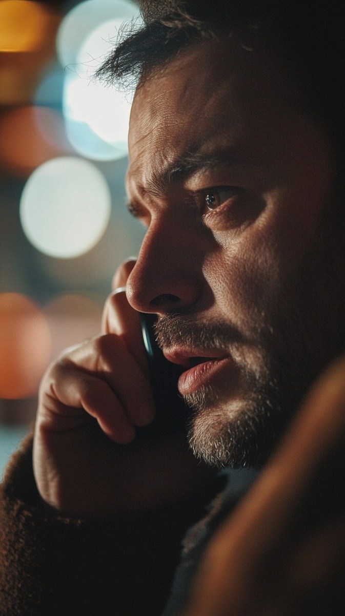 Создано на основе запроса: as if captured on a high quality 4k camera, in a bar, imagine a extreme close up shot of a mans face talking on