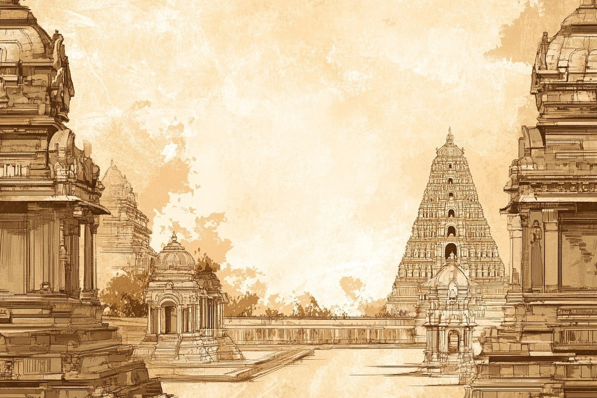 Создано на основе запроса: classic tamil nadu architectural marvels in vector illustration style