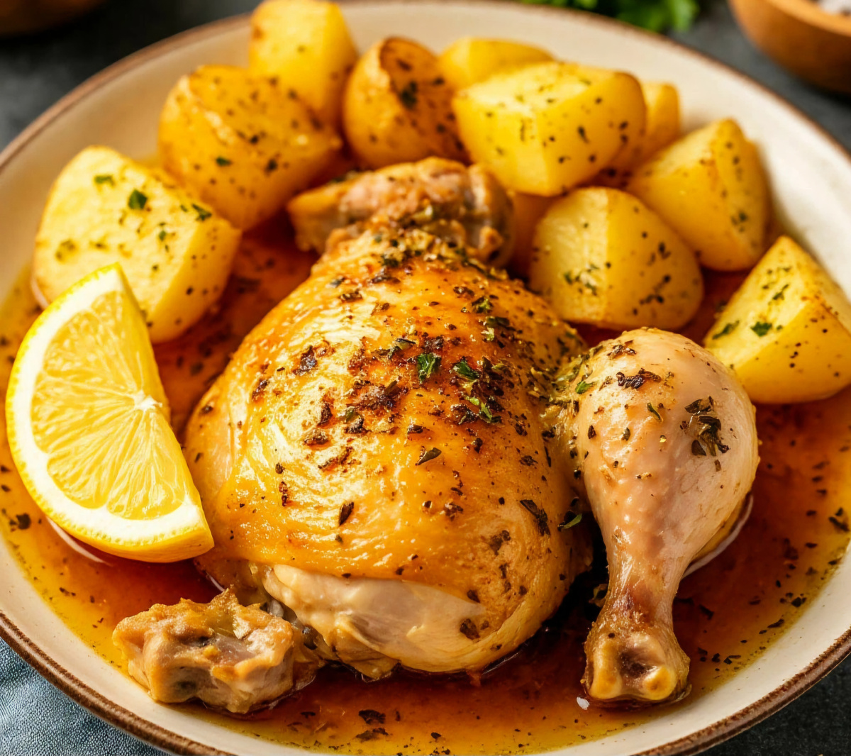 Ингридиенты: -курочка частями; -картошка; -майонез или сметана; -готовая столовая горчица; -соевый соус; -соль; -перец; -красная сладкая паприка; -карри; -чеснок. Приготовление: Шаг 1. Приготовить маринад (всего по вкусу, произвольно). Шаг 2. Картофель и курочку Уложить в маринад, накрыть крышкой (или пищевой плёнкой) и оставить мариноваться на пару часов. Шаг З. Уложить в смазанную маслом форму и запекать в духовке при температуре 220 градусов минут 40. Приятного аппетита!