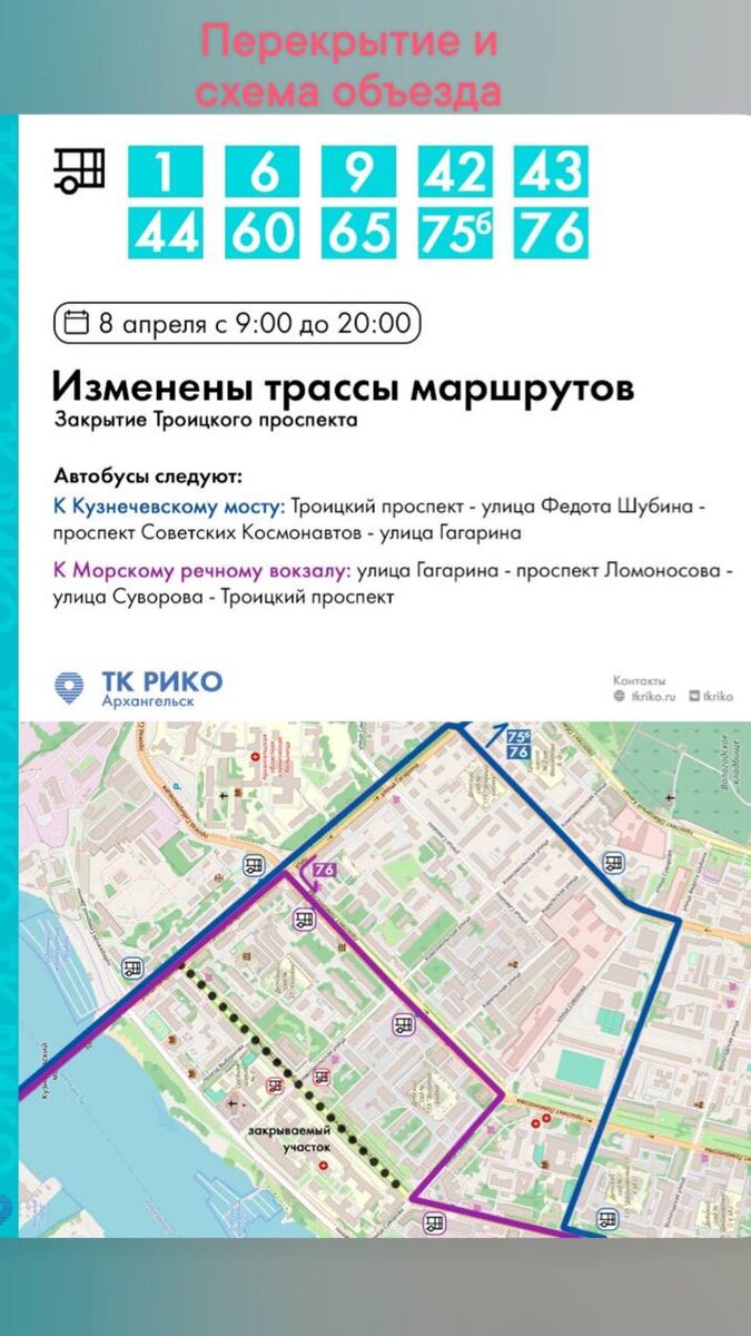 ⛔️В связи с перекрытием проспекта Троицкого от ул. Комсомольской до ул. Гагарина в период с 9:00 час. до 20:00 час 8 апреля 2025 года автобусы будут следовать: ⠀ 🔹по маршрутам NºNº 1, 6, 9, 42, 43, 44, 60, 65, 75 б, 76 ⠀ Согласно схеме 👆