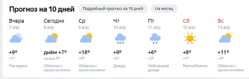 ☀️Завтра в Тюмени потеплеет до +18 градусов. Утром ожидается +1/+11, а днем столбики термометров поднимутся до +14/+18 градусов. По данным «Яндекс.Погоды», ночью с 9 на 10 апреля будет дождь, который продолжится утром в четверг, а потом и в пятницу. Солнце вернется в субботу, 12 апреля ожидается ясный день. Подписаться на РБК Тюмень