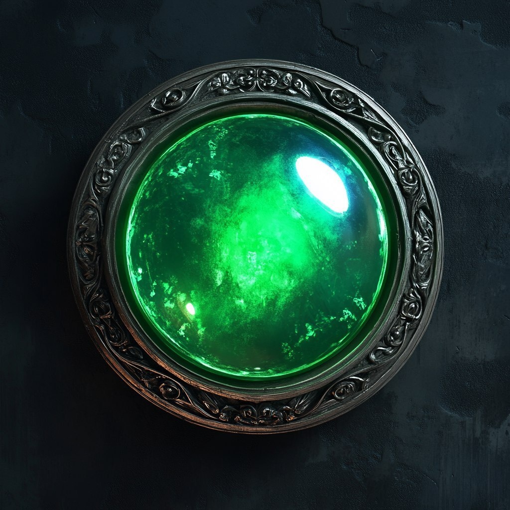 Создано на основе запроса: a glowing green mysterious steam punk button, dnd art style