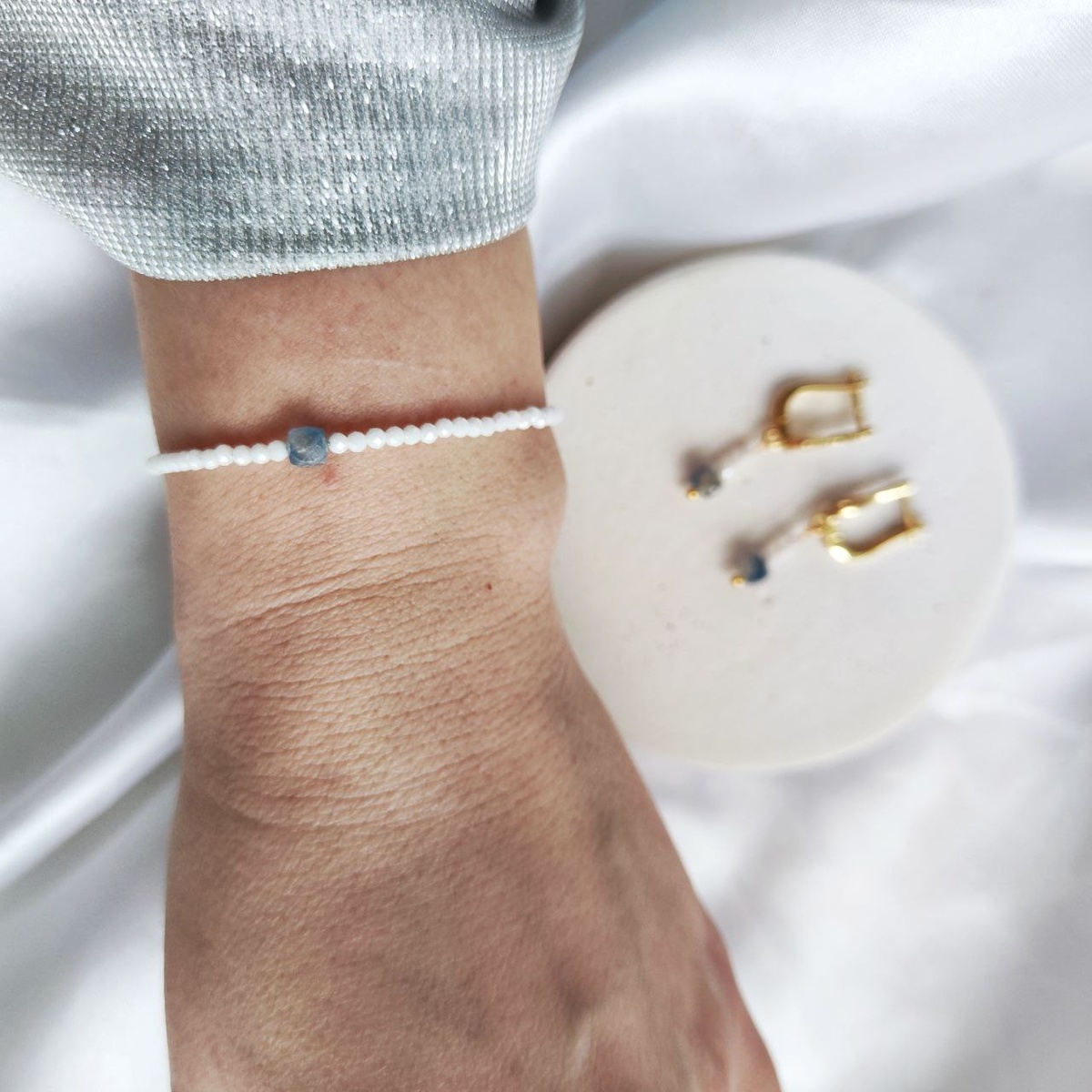 Комплект с кубиками кианита и бусинами белого циркона.
