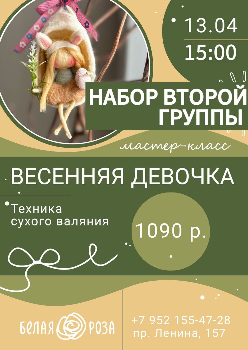 На мастер-классе вы создадите очаровательную куколку, наполненную весенним настроением и теплом ваших рук. Мы предоставим все необходимые материалы, а вы получите незабываемые впечатления и уникальную игрушку, которая станет прекрасным подарком или украшением вашего дома!