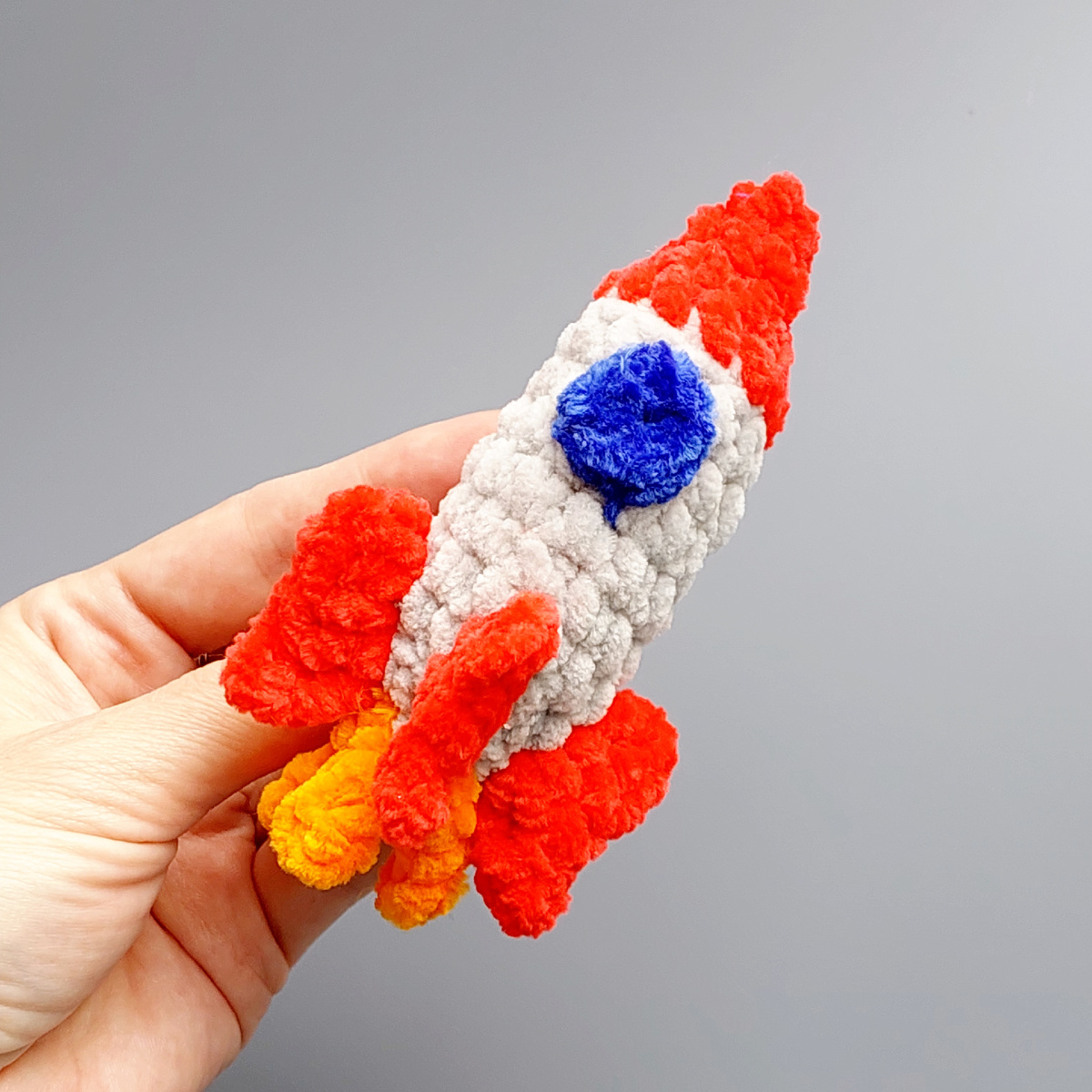 Используемые материалы: Плюшевая пряжа 100гр/120м, основной цвет светло серый ( корпус), и 3 дополнительных ( красны, синий, оранжевый). Крючок подходящего размера под вашу плотность вязания, у меня 3,75 кловер. Наполнитель, игла, маркер. Условные обозначения: КА- кольцо амигуруми Сбн- столбик без накида Пр- прибавка Уб - убавка Вп- воздушная петля Сс - соеденительный столбик Псн- полустолбик с накидом Зсп- вяжем за заднюю стенку петли Ракета цельновязанная, пришивается только эллюминатор, пламя и аэродинамические стабилизаторы вывязываются на корпусе. Набиваем в конце вязания. Начинаем вязать с основного цвета: 1. 6ка (6) 2. 6пр (12) следующий ряд вяжем за зсп 3. 12сбн (12) 4-7. 12сбн (12) в 8 ряду меням цвет пряжи на красный и вяжем за зсп 8. 12сбн (12) 9. 6уб (6) 10. 6сбн (6) 11. По возможности делаем 2уб, нить обрезаем, закрепляем. Корпус ракеты готов. Приступаем к вывязыванию аэродинамических ста