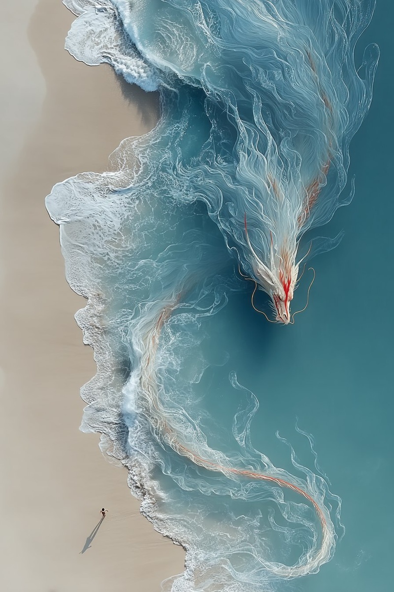 Создано на основе запроса: aerial wide angel zoom, oceanic beach slayer drenched in water bends waves to morph dragonfruitdragon surreal