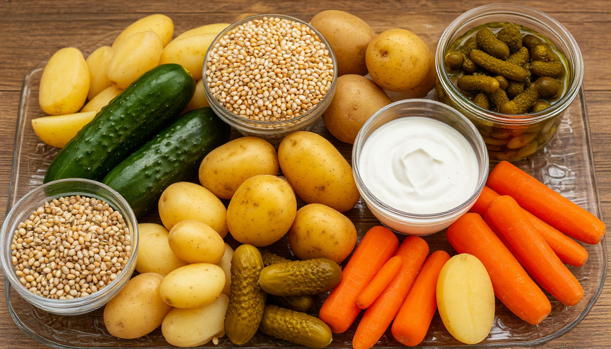 - Солёные огурцы (3-4 шт.) — главные «доктора». Если их нет, можно попробовать выловить из банки с маринованными грибами, но это уже экстремальный уровень.