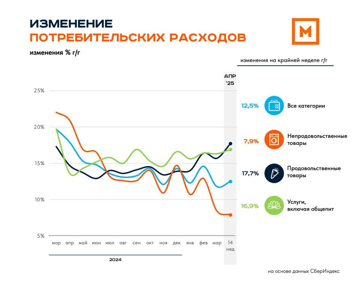 🗓 Потребительские расходы: 14 неделя Расходы на продукты подскочили! Первоапрельская неделя отличилась: развлечения рванули вверх по сравнению с прошлым годом. Правда, если глянуть на график, в апреле-2024 был небольшой провал, так что скачок не такой уж неожиданный. Ювелирка старается изо всех сил дотянуть хотя бы до прошлогодних цифр. А вот у творческих ребят с хобби, похоже, дела грустные. Или покупатели просто плюнули на старые увлечения и ушли тусить в развлечения. #СберИндекс #расходы #потребители #статистика #аналитика 👍 Знание — сила! Подписка — кнопка!