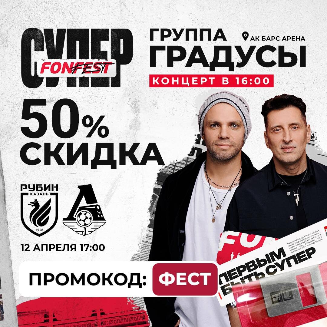 Концерт группы ГРАДУСЫ на матче ❤️х 👍 Рубин -Локомотив! Где: Ак Барс Арена Когда: 12 апреля, 16:00 Успей купить билет со скидкой 50% по промокоду ФЕСТ! www.rubin-kazan.ru/tickets 🎟 Больше информации в нашей группе, переходите