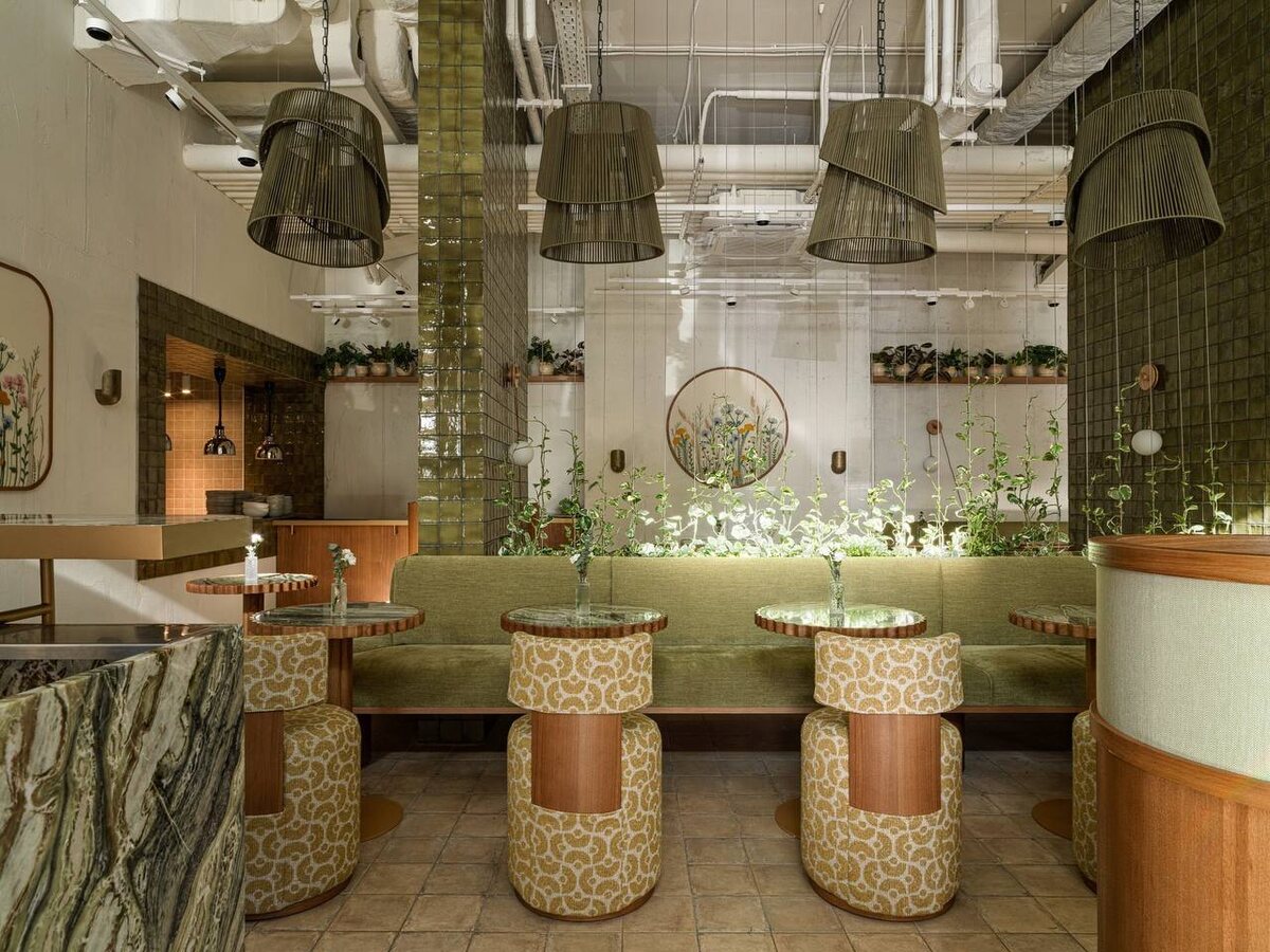 Работая над интерьером кафе в Казани, архитектурное бюро «Дюплекс» постаралось воссоздать настроение, присущее безмятежному летнему дню. Для этого авторы использовали не только теплую зеленую палитру и декор в виде растений, но и достаточно неожиданные текстуры камня и текстиля, а также световой дизайн. Фотографии © Сергей Красюк
