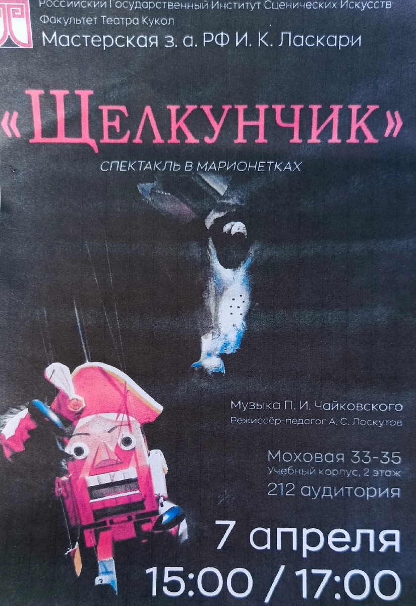 Студенты факультета театра кукол (Мастерская Ирины Кирилловны Ласкари), режиссер Александр Сергеевич Лоскутов и команда других педагогов сотворили чудесный спектакль "Щелкунчик". Вчера, в Благовещенье, мы посмотрели его. Самая первая мизансцена - крошечные куклешки на улочке зимнего городка лепят снежную бабу, карета с лошадками везет куда-то маленьких людей размером с авторучку. Чудесные старинные домики окружают пространство. И они тоже участники действия и настраивают нас на атмосферу спектакля. Прекрасная музыка Петра Ильича Чайковского звучит на всем протяжении волшебного действа. И уже непонятно, мелодия родилась из сказки или история "вышла" из звуков музыки... Сюжет адаптирован для детей, все было понятно и доступно. В спектакле были и теневые персонажи, и выразительные марионетки разных размеров, прекрасно выполненные. Вождение куклами, на мой взгляд, было безукоризненным. Снежинки были легки. Их танец завораживал не только Мари и племянника Дроссельмейера, но и нас, зри