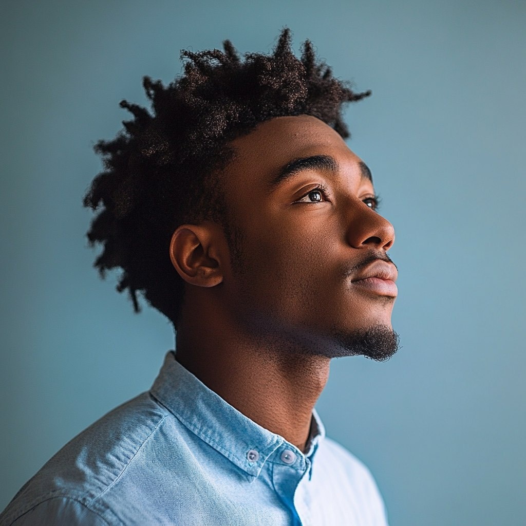 Создано на основе запроса: african american male looking right, he is wearing a a blue shirt