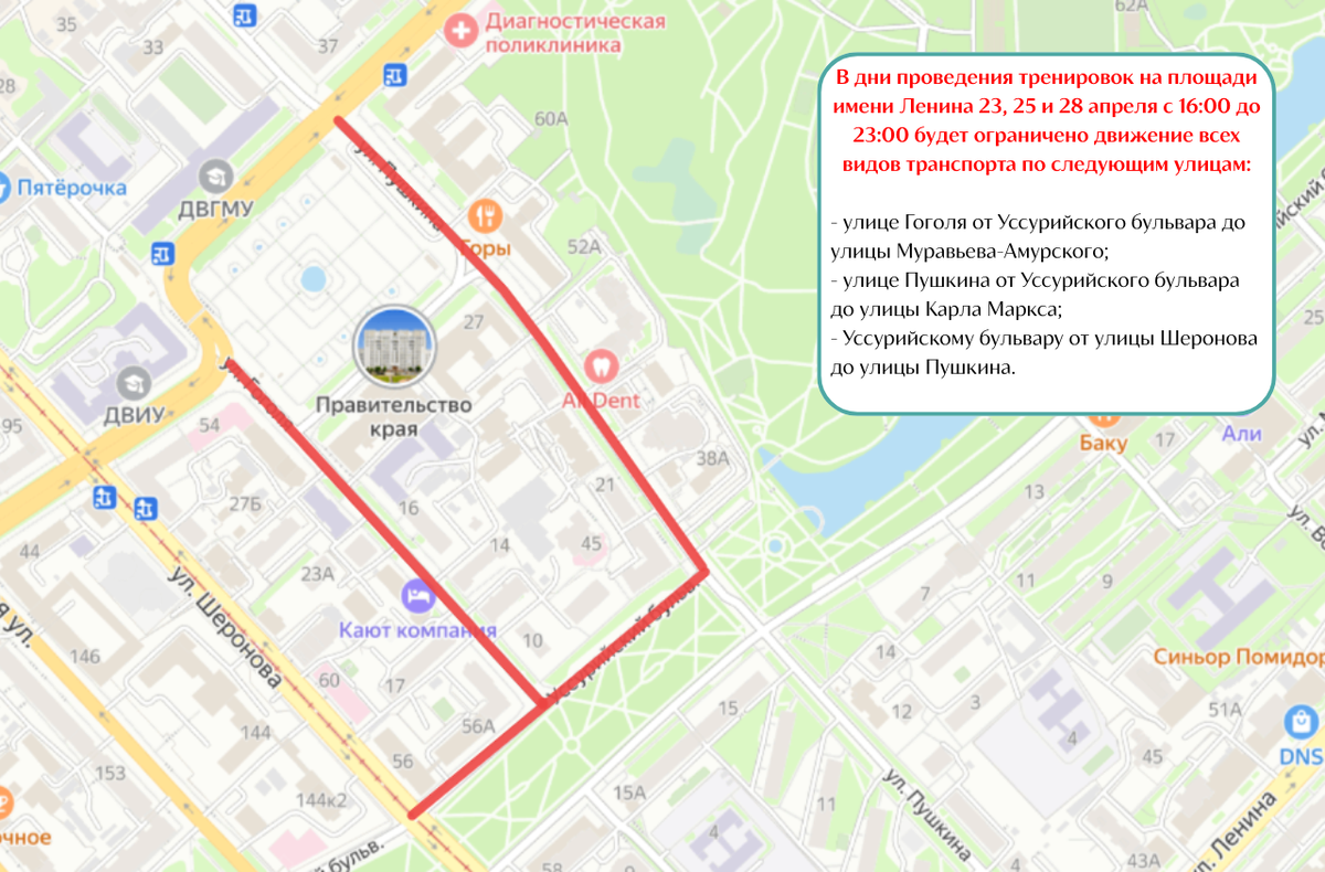 В соответствии с проектом постановления мэрии Хабаровска движение на дорогах краевого центра ограничат в связи с репетициями Парада 23, 25 и 28 апреля (пешие тренировки), а также 30 апреля, 2 и 5 мая (с техникой). На 7 мая запланирована генеральная репетиция. В дни проведения тренировок на площади имени Ленина 23, 25 и 28 апреля с 16:00 до 23:00 будет ограничено движение всех видов транспорта по следующим улицам: - улице Гоголя от Уссурийского бульвара до улицы Муравьева-Амурского;- улице Пушкина от Уссурийского бульвара до улицы Карла Маркса;- Уссурийскому бульвару от улицы Шеронова до улицы Пушкина. Будет запрещена стоянка транспортных средств 23, 25, 28 апреля 2025 года с 13:00 до 23:00 на следующих улицах: - улице Гоголя от Уссурийского бульвара до улицы Муравьева-Амурского;- улице Пушкина от Уссурийского бульвара до улицы Муравьева-Амурского;- Уссурийском бульваре от улицы Шеронова до улицы Пушкина. На период прохождения механизированных колонн 30 апреля, 02, 05 мая 2025 года с 16
