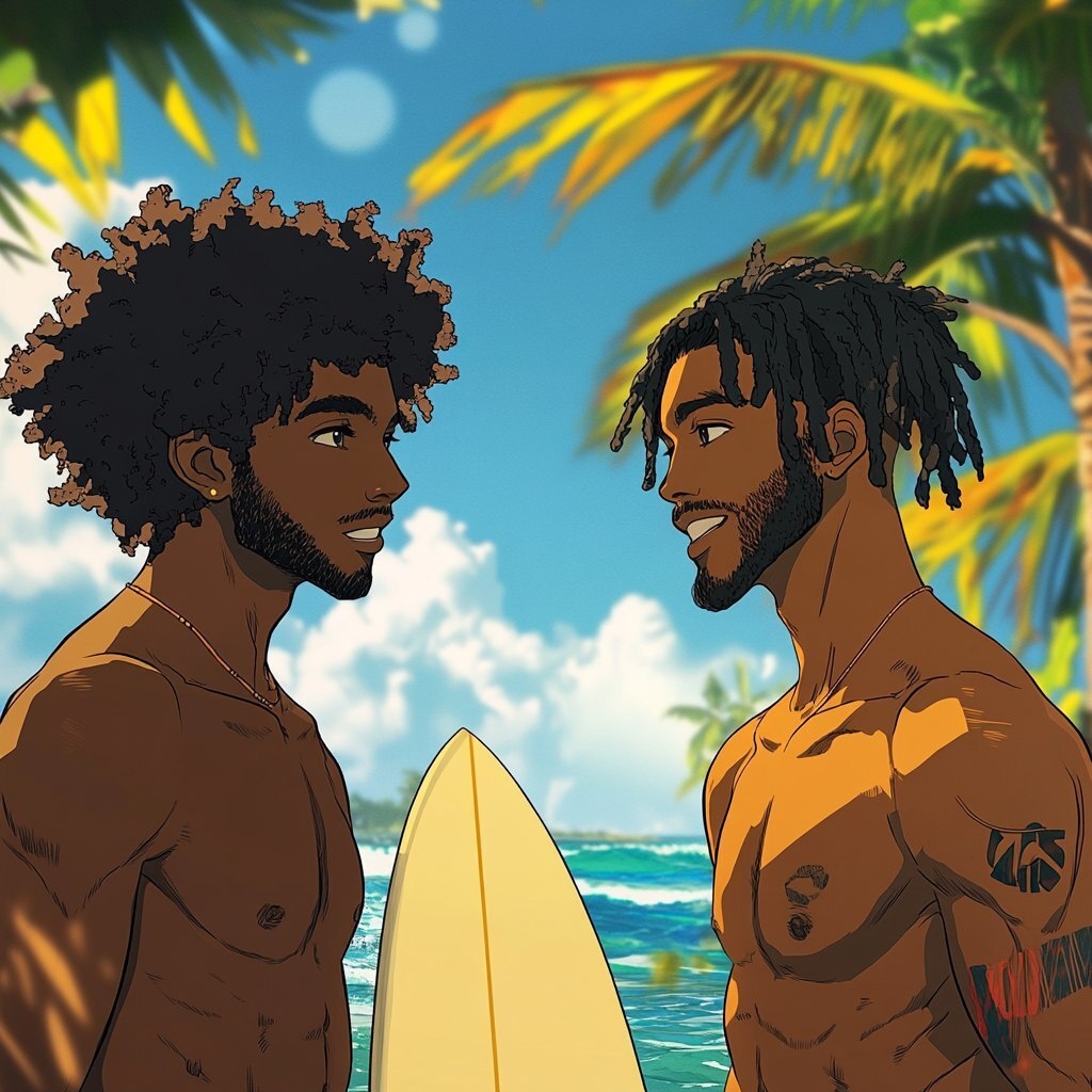 Создано на основе запроса: manga, anime, two black brown skin man one with an afro and light facial hair and the other with short dreads and very light facial hair are having a conversation on the surfboards in Bali --- Автоперевод: Манга, аниме, два черных коричневых коже, один с афро и легкими волосами на лице, а другой с короткими страхами и очень легкими волосами на лице разговаривают на досках для серфинга на Бали Как тебе эта генерация? 🤔 https://dzen.ru/id/65c0c65c86e4f837c27b24d7 #ИИ #AI #нейросеть #midjourney #art