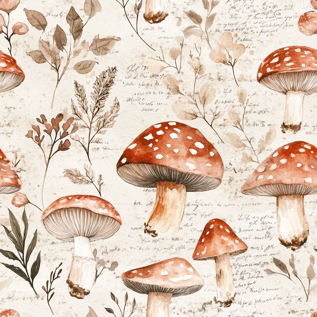 Создано на основе запроса: seamless pattern, watercolor mushrooms and hand-lettered Psalm verses, soft earth tones, vintage cottagecore