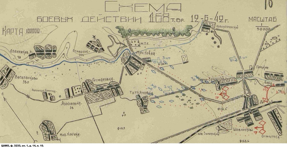 34-я мотострелковая бригада в этом наступлении не участвовала и на основании боевого приказа № 10 штаба 22-го ТК оставалась в обороне, в т.ч. ее левофланговый 34-й мотострелковый полк к середине дня оборонялся в 500 метрах восточнее Петровского, а правофланговый 32-й мотострелковый полк продолжал удерживать рубеж высот 178,0 и 184,5 на западном берегу Большого Бурлука. Прибывший на ее усиление 11 июня 1238-й истребительно-противотанковый полк выставил свои 1-ю и 2-ю батареи на поддержку 34-го мотострелкового полка, а 4-ю и 5-ю батареи – на поддержку 32-го мотострелкового полка. К этому времени к ранее противостоявшим 32-му полку 2-му батальону 64-го МП и 2-му батальону 79-го МП (16-я ТД) присоединился батальон 194-го пехотного полка 71-й пехотной дивизии, таким образом против советского плацдарма немцы смогли сосредоточить 3 своих пехотных батальона.