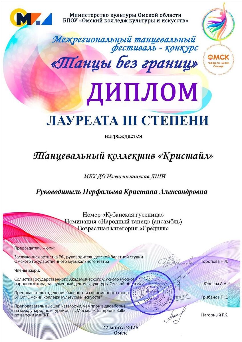 🔤🔤🔤🔤↩️🌟 Ещё одна победа «КРИСТАЙЛ» 💃 Танцевальный коллектив под руководством Кристины Александровны Перфильевой принял участие в Межрегиональном танцевальном фестивале-конкурсе «Танцы без границ». По итогам конкурса коллектив награжден дипломом 3 степени в номинации «Народный танец» с номером «Кубанская гусеница».