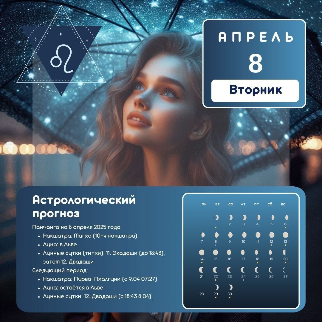 Астрологический прогноз на 8 апреля: День Огня, Тайн и Трансформации _Лев рычит, звёзды шепчут, а Бхадра смеётся... Как пройти этот день без потерь и обрести силу экадаши?_ 🌌 Космический коктейль дня: Вторник, управляемый Марсом, заряжен жаждой действия, но Луна во Льве добавляет театральности и желания блистать. Однако до 18:43 (мск) Мритью-йога (йога смерти) напоминает: спешка и необдуманные поступки могут обернуться кармическими уроками. Спасательный круг — пост Камада Экадаши, который, согласно легенде, спас гандхарва от демонической участи. Ваша аскеза сегодня — ключ к разрыву цепей прошлого. 🔥 Где прячется опасность? - Рот Бхадры (12:22–14:28) — даже в Абхиджит-мухурту (12:05–12:59) Бхадра, "зловещая дочь Шивы", активизируется. Луна во Льве усиливает её влияние: она "ходит по Земле", искажая энергии. Но здесь парадокс: злые дела в этот период принесут плоды... злу. А вот праведные действия, напротив, станут мечом против тьмы. - Шула-йога до 15:40 — острые конфликты, споры. С
