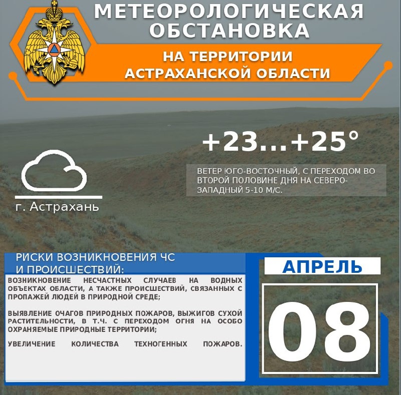 ☔️ Метеорологическая обстановка на 08 апреля. 🌧На территории области переменная облачность.⚡️ Местами кратковременный дождь, гроза. Ветер юго-восточный, южный с переходом во второй половине дня на северо-западный порывами 15-20 м/с.🌡 Температура воздуха +20...+25°, по северу области +17...+20°. ☁️По г. Астрахань переменная облачность. ☂️Без существенных осадков. Ветер юго-восточный с переходом во второй половине дня на северо-западный 5-10 м/с, вечером порывами 15-17 м/с. 🌡Температура воздуха +23...+25°.