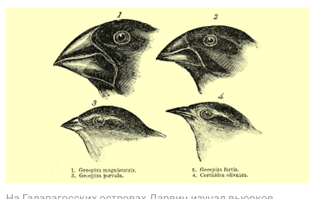 На теорию изменчивости видов Дарвина натолкнули наблюдения за галапагосскими вьюрками. Натуралист обратил внимание, что на каждом из островов вьюрки имеют свою форму клюва.