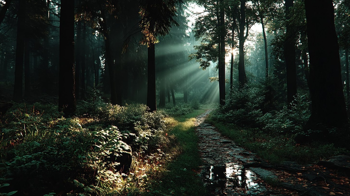 Создано на основе запроса: Mystical dark forest in the rays of the setting sun, Photorealistic, Cinematic, HDR
