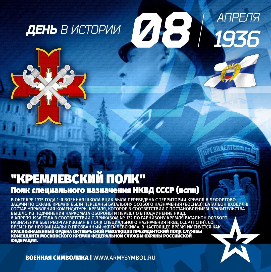"Кремлевский полк" Полк специального назначения НКВД СССР (пспн) комендатуры Кремля, которое в соответствии с постановлением правительства вышло из подчинения Наркомата обороны и перешло в подчинение НКВД. 8 апреля 1936 года в соответствии с Приказом № 122 по гарнизону Кремля Батальон особого назначения был реорганизован в Полк специального назначения НКВД СССР (пСпН), со временем неофициально прозванный «Кремлёвским». в настоящее время именуется как Краснознаменный ордена Октябрьской революции Президентский полк службы Коменданта Московского Кремля Федеральной Службы Охраны Российской Федерации. #ПамятныеДатыВоеннойИсторииОтечества #ДеньВИстории #ГодЗащитникаОтечества #80ЛетВеликойПобеды Источник: https://vk.com/wall-60767131_30336 Подпишитесь на наши группы ВКонтакте и в Одноклассниках - читайте, смотрите и комментируйте! Источник