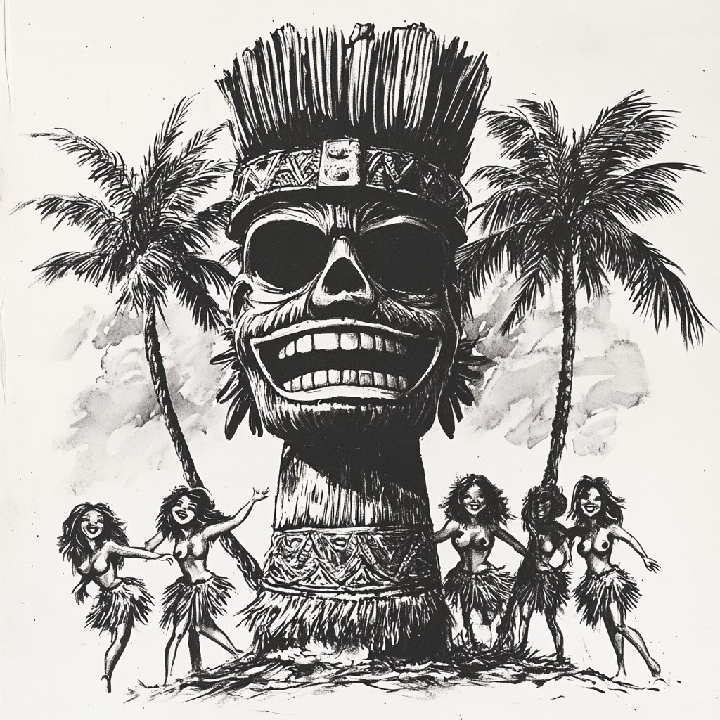 Создано на основе запроса: wild looking tiki, palm trees, girls in hula skirts, logo, pulp art, simple