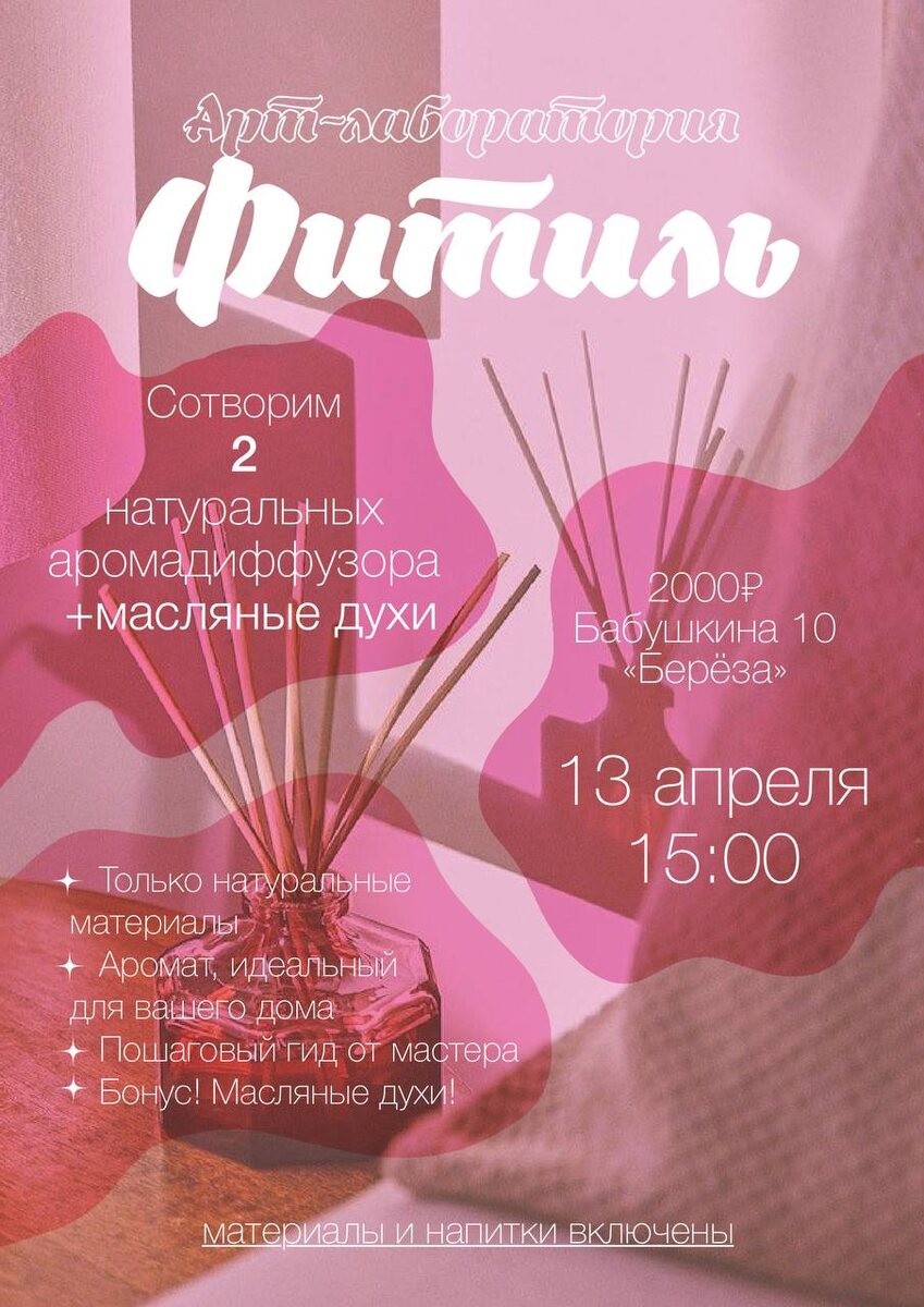Арт-лаборатория «Фитиль» приглашает на мастер-класс по созданию натуральных аромадиффузоров На мастер-классе вас ждет: ✨Создание сразу двух ароматов для дома ✨Погружение в мир натуральных эфирных масел ✨ Советы по подбору композиций для дома, офиса или подарка ✨Приятная атмосфера и вдохновляющая компания ✨Бонус: создание масляных духов 🕐13 апреля, 15:00 📍Бабушкина, 10 «Берёза» 🪙 2000 рублей 🔑для записи пишите @Anastasia_refry_time #Афиша Предложить публикацию @zabkulisye_bot