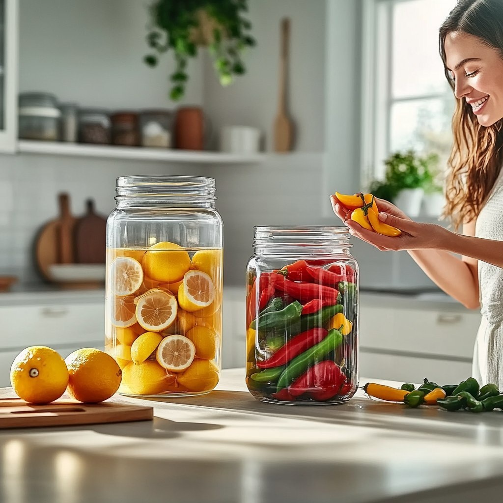 Создано на основе запроса: Real shot, on the table of the indoor kitchen, there are two cylindrical glass jars with a large mouth and a large capacity, one jar is filled with lemons and honey, and the other jar is filled with colored peppers and water. There is an American woman holding colored peppers next to her. Bright white kitchen background.