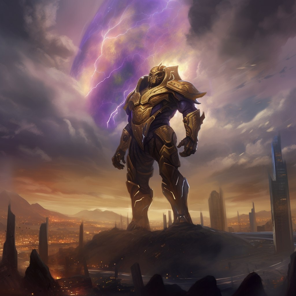 Создано на основе запроса: a titan, a city of clouds, purple and gold, lightning, magic the gathering art style, high definition