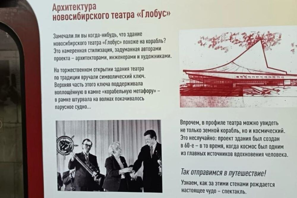 В Новосибирском метрополитене появился новый тематический вагон. Он посвящен празднованию 95-летия театра «Глобус». К юбилею театра разработана программа мероприятий, объединенная единым слоганом «Искусство в движении!». Представленная выставка «8 шагов к спектаклю» — это один из проектов программы. В театре решили приоткрыть завесу тайны и рассказать пассажирам метро, что происходит за кулисами при подготовке спектакля. Директор театра «Глобус» Татьяна Людмилина поблагодарила руководство Новосибирского метрополитена за поддержку проекта и выразила надежду, что выставка послужит стимулом для привлечения в театр новых зрителей. Фото: Новосибирский метрополитен