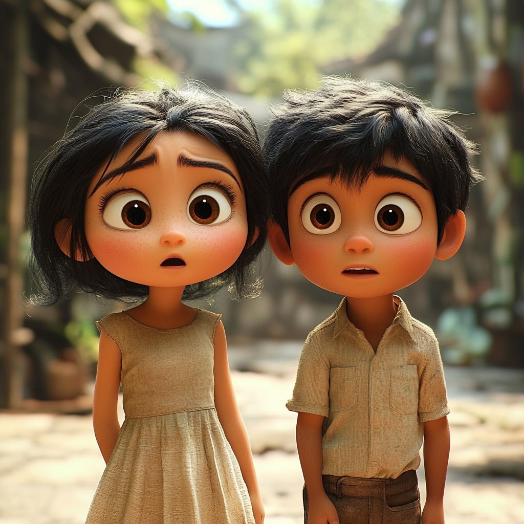 Создано на основе запроса: i need a pixar looking small girl and boy full body very cute and pakistani looking darkish kids with big googly eyes and deep expression